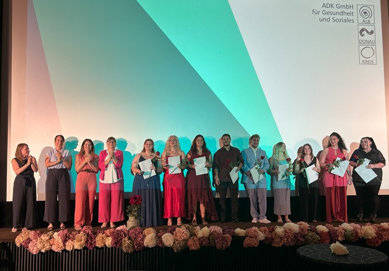Nach einem Sektempfang begrüßten Birgit Jäger, Leitung der ADKmie, und Verena Rist als Vertreterin der Geschäftsführung die Anwesenden. Beide betonten das besondere Ambiente des Kinosaals und verglichen in ihrer Rede die dreijährige Ausbildung mit einer Schiffsreise: vom Stapellauf über verschiedene Stationen wie Maschinenraum oder Kombüse bis hin zur Einfahrt in den sicheren Hafen. Auch wenn unterwegs raue See herrschte, sei die Fahrt erfolgreich gewesen. Verena Rist hob hervor, dass mit dem Ausbildungsende nicht das Ziel, sondern ein neuer Abschnitt auf dem beruflichen Weg beginne – und freute sich, dass viele Absolventen der ADK GmbH erhalten bleiben.
