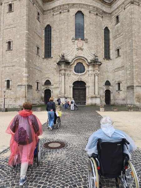 Gemeinsam mit dem Förderverein, den Mitarbeitenden von BS und zwei Betreuungskräften der Einrichtung machten sich die Bewohnerinnen und Bewohner – in zwei Gruppen – auf den Weg durch Wiblingen. Die Route war so gestaltet, dass sie für Rollstuhlfahrer gut geeignet war und gleichzeitig spannende Rätsel und Aufgaben bot. Die Begleitung durch vertraute Gesichter des Fördervereins sowie die tatkräftige Unterstützung der BS-Mitarbeitenden sorgten für eine fröhliche und sichere Atmosphäre. Zu lösen waren z.B. Fragen zu den Öffnungszeiten des Museums im Kloster Wiblingen, nach dem Erbauer des Legomodells der Orgel in der Basilika oder nach dem Namen der Bushaltestelle an der Apotheke Wiblingen.