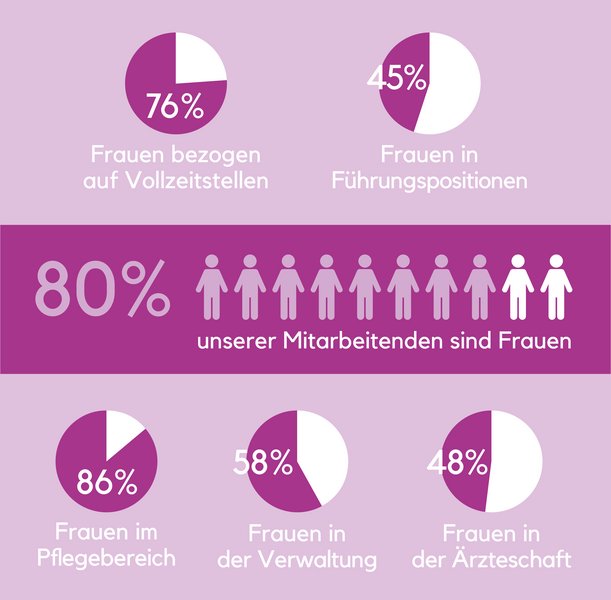 Besonders hoch ist der Frauenanteil in der Pflege mit 86 Prozent, in einzelnen Bereichen wie der Geriatrischen Rehaklinik liegt dieser gar bei 96 Prozent. In der Zentralverwaltung arbeiten 78 Prozent Frauen – ein Bereich, in dem diese Verteilung häufig weniger erwartet wird.