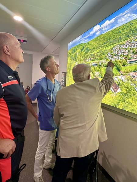 Auf besonderes Interesse stieß der Besuch auf der Intensivstation, wo Dr. med. Markus Winter, Chefarzt für Anästhesie und Intensivmedizin, die neuesten technischen Entwicklungen präsentierte. Die im Herbst 2021 fertiggestellte Intensivstation ist eine der modernsten in der Region. Sie ist ausgestattet mit einem System zur Lärmunterbindung und einer Beleuchtung, die sich dem natürlichen Tagesrhythmus anpasst. Besonders berührte den Gast das große hinterleuchtete Wandbild mit einer Luftaufnahme von Blaubeuren: Einen Moment lang blieb er davor stehen, suchte lächelnd auf der Karte nach seinem früheren Haus – und schwelgte in Erinnerungen an seine Zeit in der Stadt und an die Menschen, die ihn damals begleitet haben.