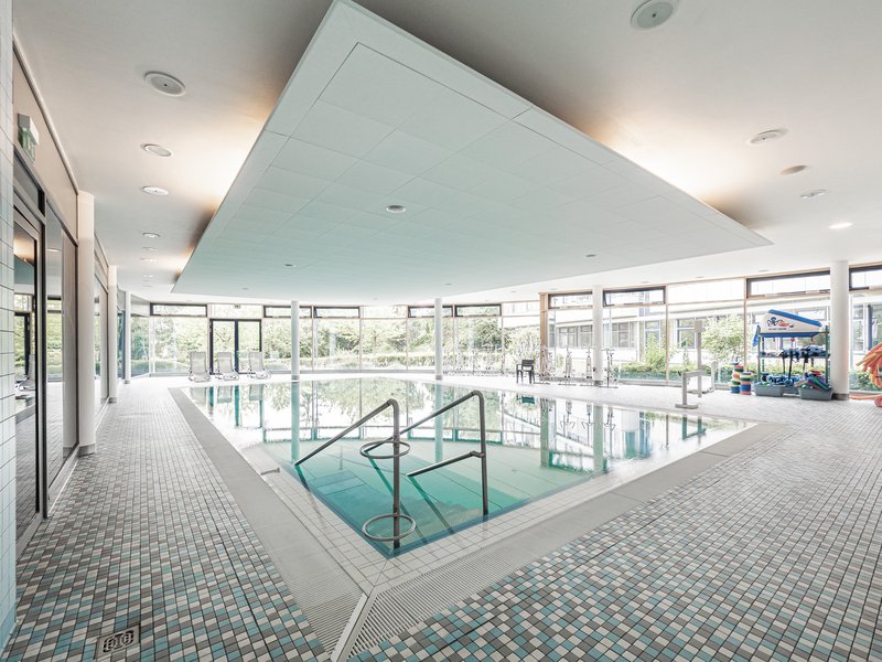 Durch eine breite Glasfront können Sie Ihren Blick während des Trainings in der Gartenanlage schweifen lassen.